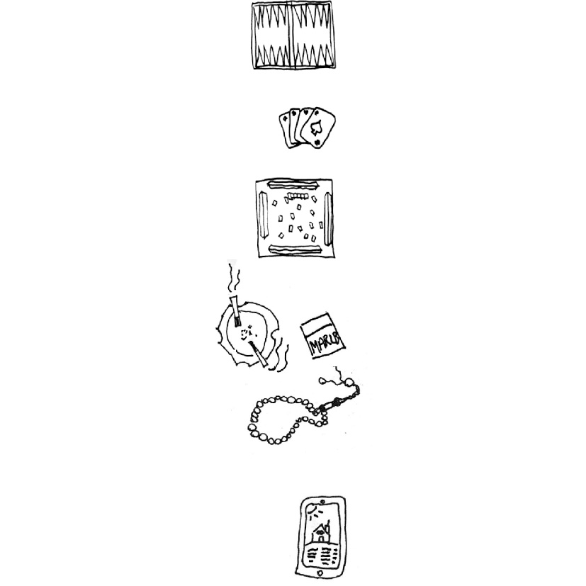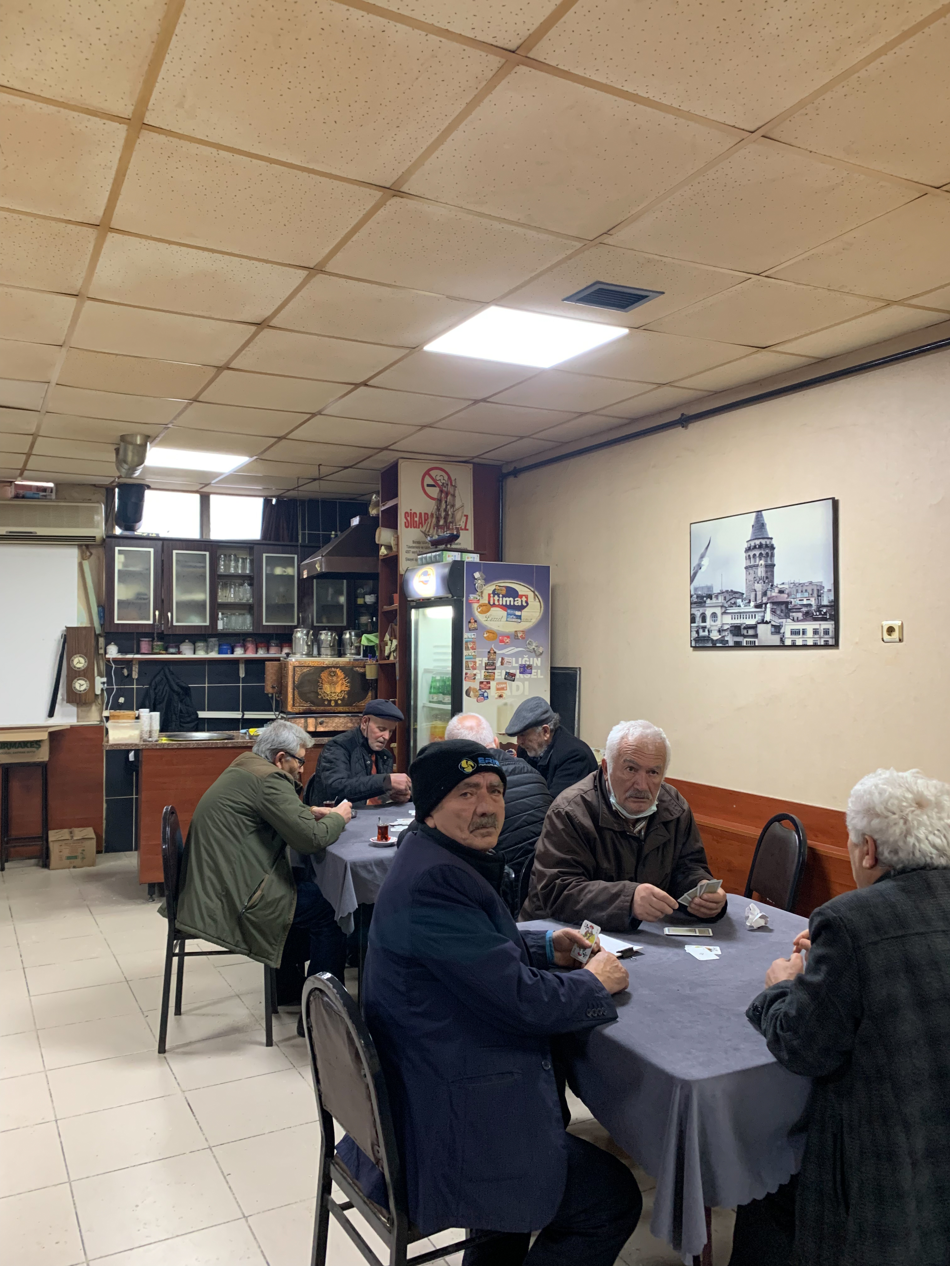The tables are filled with games such as Backgammon, Cards, and Okey. Despite smoking being forbidden, the men are consistently smoking cigarettes at the table while they play, with the waiter collecting the ashtrays as they fill. Many men are also constantly playing with their prayer bads throughout their time at the Kahvehane. Despite their age, they are all using Smartphones, and were presenting their new summer home they built in the Ordu countryside.